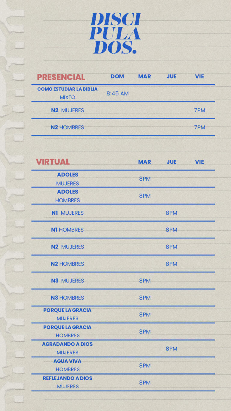 Nuestros grupos de discipulado tienen como fin ayudar a la iglesia a fortalecer su caminar con Dios y a proveer un espacio para la comunión e interacción entre los creyentes.